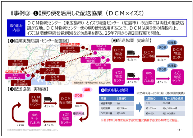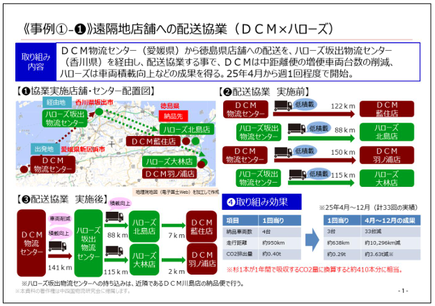 ①遠隔地店舗への配送協業(DCM×ハローズ、DCM×フジ)