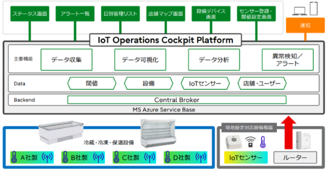 ベイシアでは、店舗内各所に設置された冷蔵・冷凍設備に装着したIoTセンサーから、温度情報をリアルタイムに抽出し、可視化する。これにより、店舗従業員は手作業による点検・記録業務が不要になり、作業負担が大幅に軽減される。