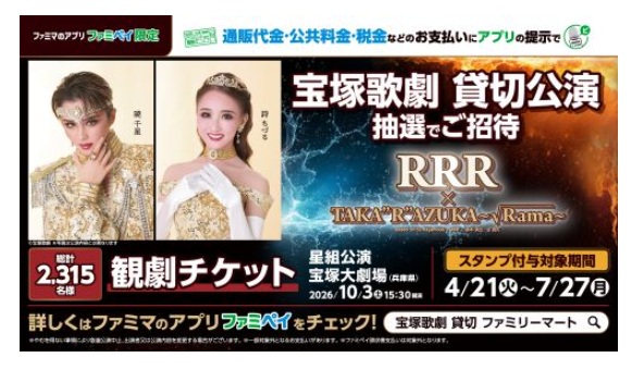 ファミリーマート(本社:東京都港区、代表取締役社長:細見研介)は、通販代金・税金・公共料金などの支払いに、ファミマのアプリ「ファミペイ」を提示しスタンプをため、コースを選んで応募すると宝塚歌劇星組貸切公演のチケットなどが抽選で当たるキャンペーンを実施する。4月21日(火)から7月27日(月)まで、全国のファミリーマート約1万6400店で実施する。