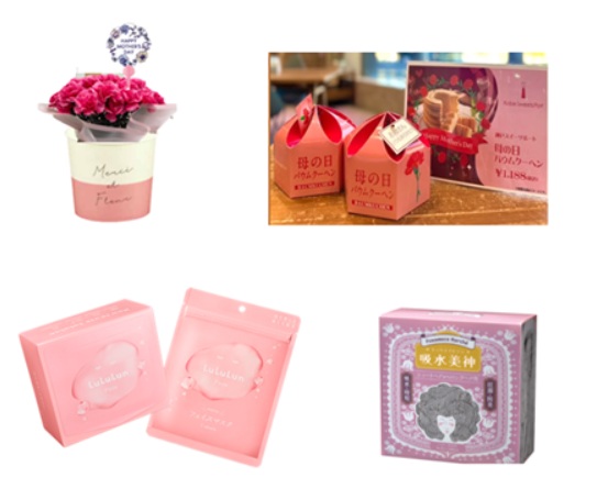「カーネーションMIX(5号)」2180円(本体価格、以下同)。「神戸ポート 母の日バウムクーヘン」1100円。「ルルルンピュアエブリーズ(32枚入)」1600円。「吸水美神 ヘアータオル」800円。