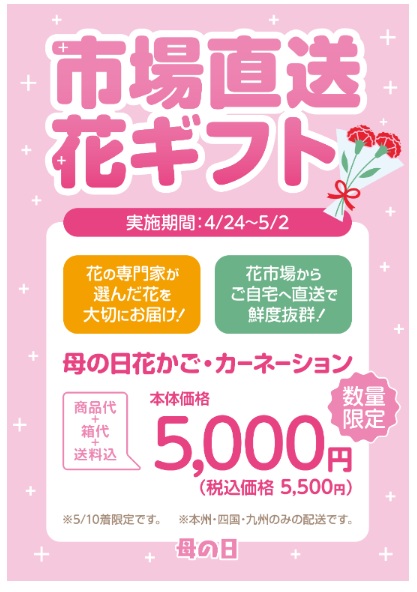 また母の日に合わせ、フラワーギフトを市場からご自宅へ直送する「市場直送 花ギフト」の配送サービスを、PLANT一部店舗で数量限定で実施する。