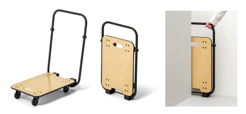 ■木材の質感を活かした「木製サイレントキャリー」。ハンドルなどの配置荷台面はフルフラットで、手押し台車と平台車の2通りで使用可能。静音キャスターを採用し、折りたたむと厚さ約12cmで自立収納も可能だ。価格は4980円(税込価格、以下同)。同商品は2025年度のグッドデザイン賞も受賞している。