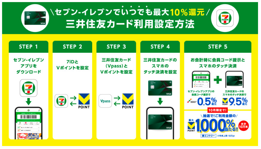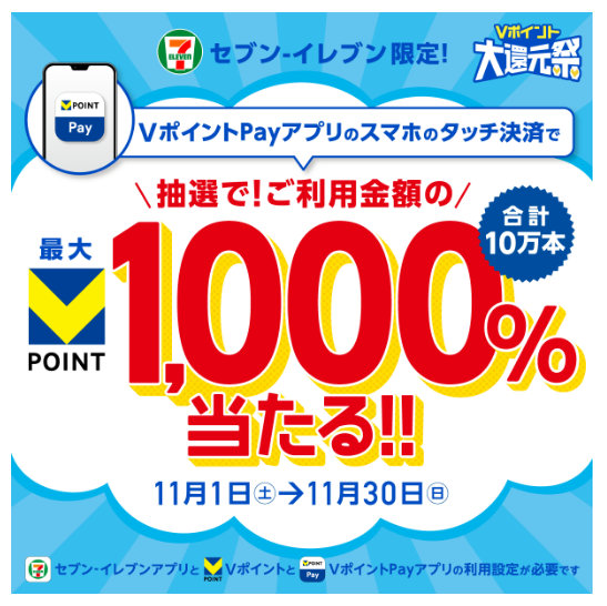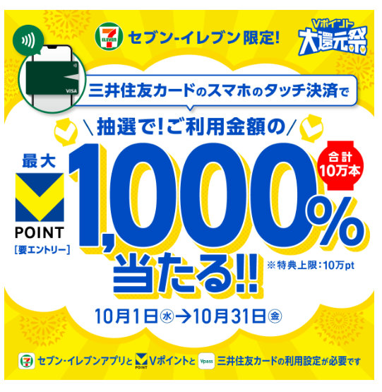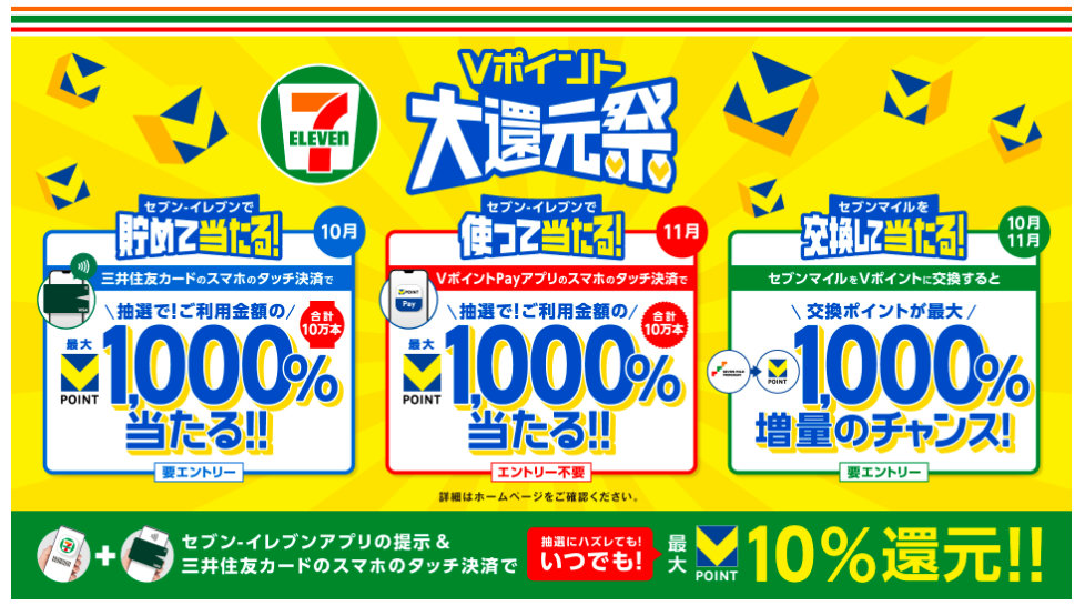 「Vポイント大還元祭」の第1弾では、キャンペーンサイトからエントリーし、Vポイントの利用設定を完了の上、セブン-イレブン店頭で三井住友カードのスマホのタッチ決済を利用すると、通常のVポイント10%還元分に加え、利用金額の最大1000%分のVポイントが抽選で当たる。1等は利用金額の1000%、2等は100%、3等は1%分のVポイントが獲得できる。