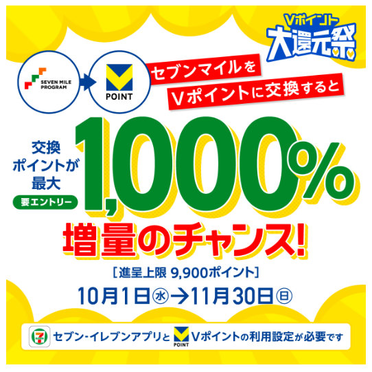 さらに10月1日(水)から11月30日(日)のキャンペーン期間中は、「セブンマイル」を「Vポイント」へ交換すると、通常のVポイント交換分に加え、最大1000%分のVポイントが抽選で当たる。1等は交換したポイント数の1000%、2等は500%、3等は300%、4等は200%分のVポイントが上乗せで獲得でき、5等は交換ポイント数に関わらず5ポイント獲得できる。当選本数は20万本。
