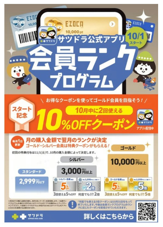 また会員ランクプログラムの開始に伴い、サツドラ公式アプリをダウンロードしている人限定で、10月中に2回使える10%OFFクーポンをサツドラ公式アプリ利用客に配布するキャンペーンを、10月1日から実施する。