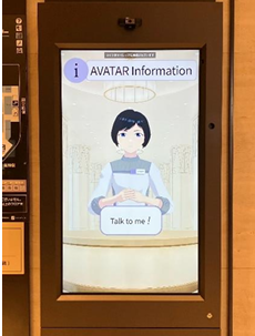 阪急うめだ本店 1階 JR側 8番出入口 に設置した55インチモニターを使い、アバタースタッフが遠隔で店内を案内。サービスなどの問い合わせに回答する。AIの活用で約100言語を文字表示で対応することで、増加する訪日外国人に向けた多言語化対応によるユニバーサルなサービスの標準化を目指す。