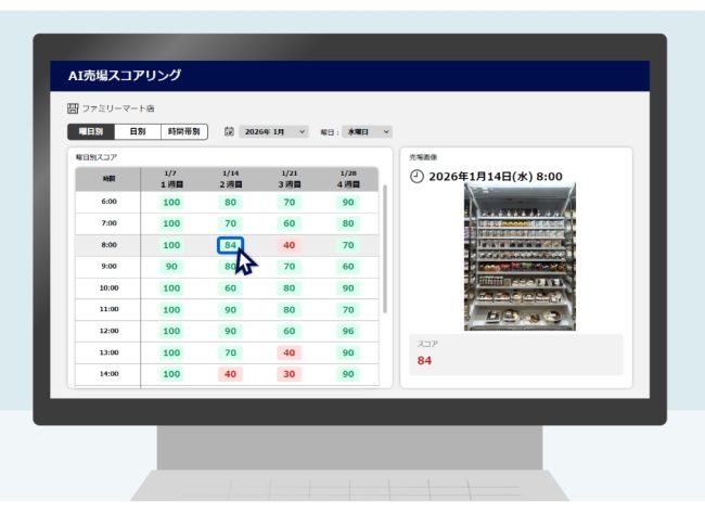 (株)ファミリーマート(東京都港区、細見研介社長)は1月中旬から、店舗に設置している防犯カメラで売場を撮影し、AIで売場の状態を点数化する新たな店舗運営支援システム「AI売場スコアリング」の実証実験を、首都圏の一部店舗で開始する。