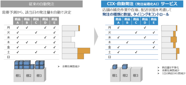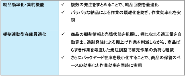 AIとデジタルツイン技術により、従来の自動発注と比較して、棚最大量を超えない範囲で数量とSKUとタイミングを適正化することで、発注業務の効率化と過剰在庫抑制につなげる。さらに店舗側の補充作業などのオペレーションコストを削減することができる。対象はグロサリー、菓子、日配品、生活用品など約2万8000SKU。削減効果は各店舗で月間180人時、過剰在庫約30%の削減を見込んでいる。