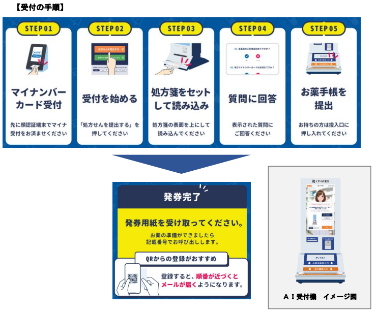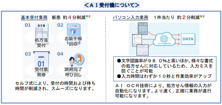 「AI受付機」導入によって、受付やお薬受け取りの待ち時間が短縮される。また体調不良の中で会話せずに受付が可能になるなど、患者の負担を軽減することが可能となる。さらに受付業務が効率化し、ピッキング、調剤業務、服薬指導などの専門的な業務の時間に充てることでサービスのレベルを向上させる。