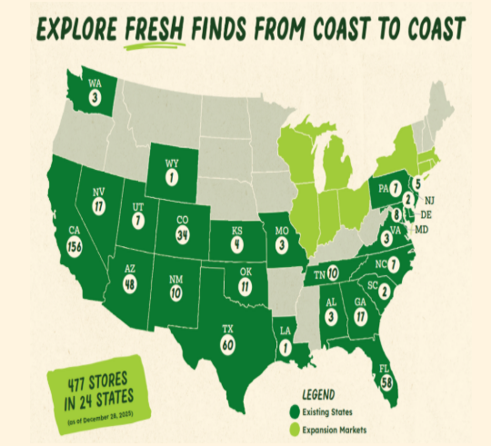スプラウツは出店戦略を積極的に進め、年間で37店舗を新規開設した。期末時点で24州に477店舗を展開する。2026年にはさらに40店舗以上の新規出店を計画している。